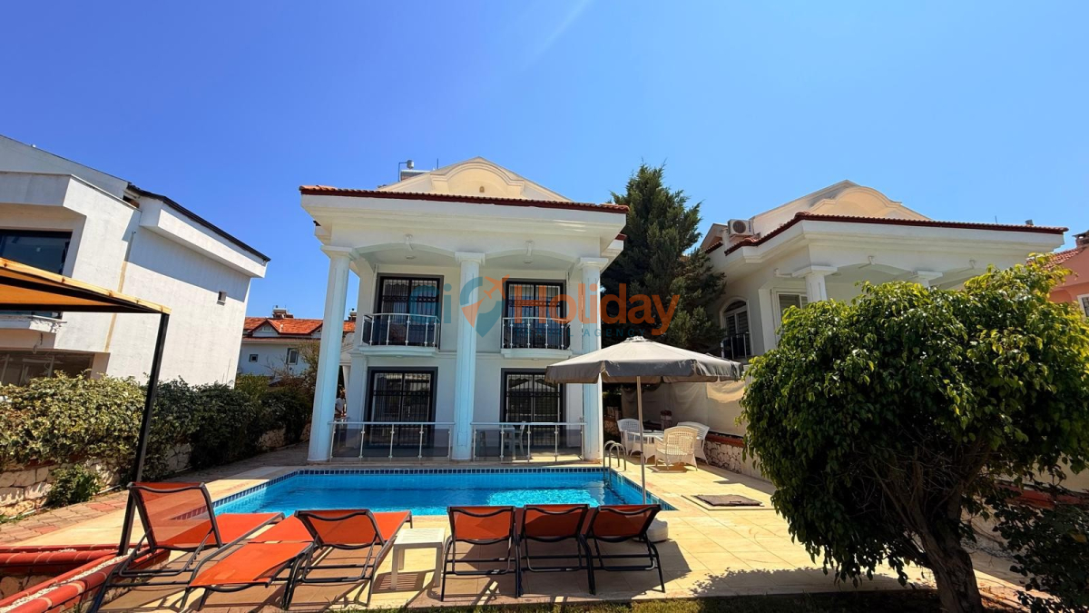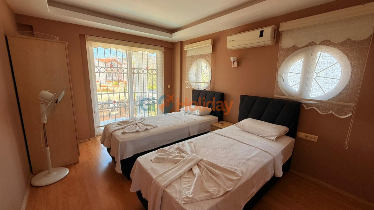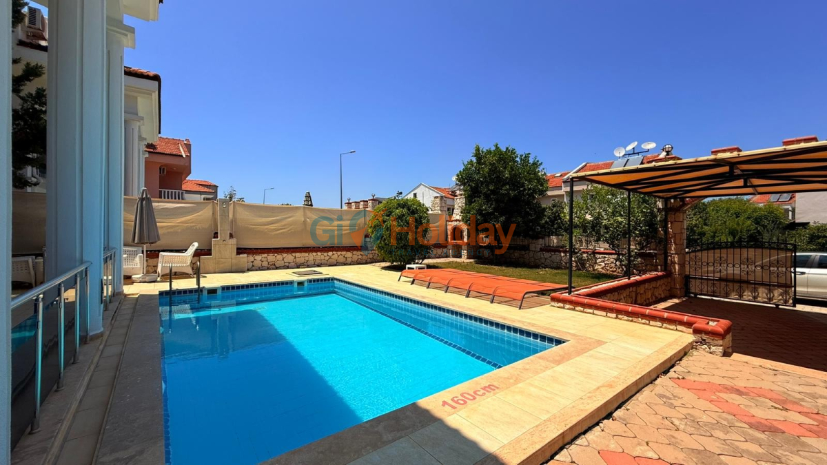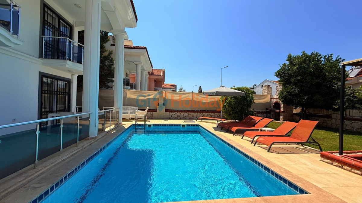 Fethiye Çalış mevkiinde konumlandırılan villamız 3 yatak odası, 2 açılabilir ek yatak ve 2 açılabilir kanepesiyle birlikte 10 kişilik konaklama kapasitesi sunmaktadır. Kısmi korunaklı havuz alanına sahip villamız kalabalık aile ve gruplar için ideal seçeneklerden bir tanesidir. Dış mekanda kapasiteye uygun özel yüzme havuzu, şezlong takımları ve yemek masası yer almaktadır. Market ve restaurant ulaşımı da oldukça rahat olan villamız Fethiye tatilinizde en güzel hatıralarınıza ev sahipliği yapacaktır.