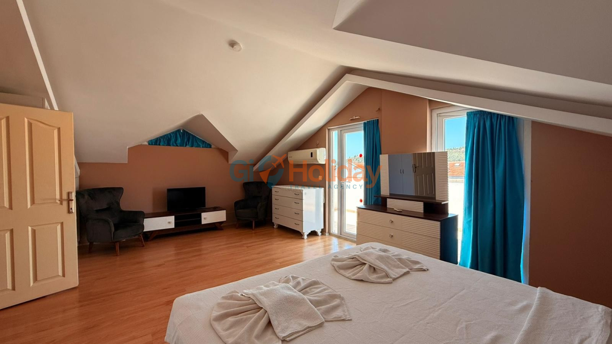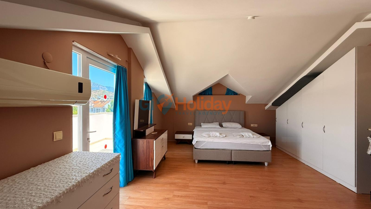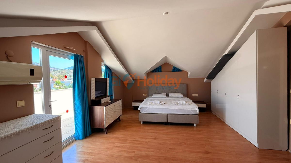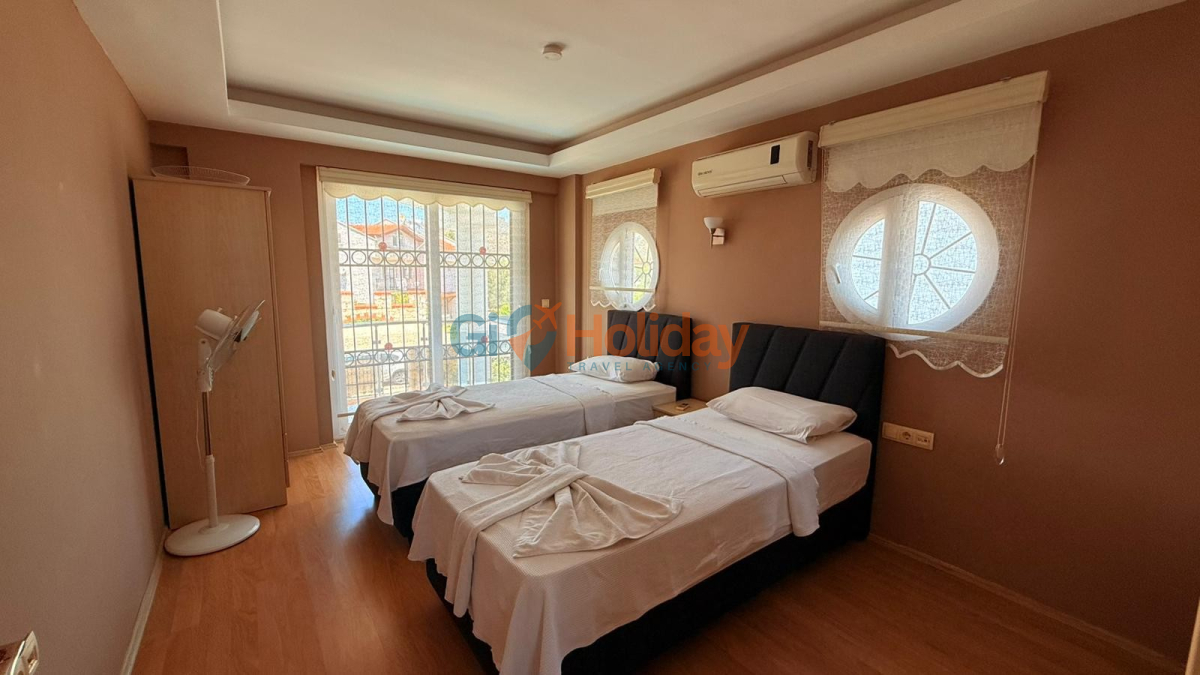 Fethiye Çalış mevkiinde konumlandırılan villamız 3 yatak odası, 2 açılabilir ek yatak ve 2 açılabilir kanepesiyle birlikte 10 kişilik konaklama kapasitesi sunmaktadır. Kısmi korunaklı havuz alanına sahip villamız kalabalık aile ve gruplar için ideal seçeneklerden bir tanesidir. Dış mekanda kapasiteye uygun özel yüzme havuzu, şezlong takımları ve yemek masası yer almaktadır. Market ve restaurant ulaşımı da oldukça rahat olan villamız Fethiye tatilinizde en güzel hatıralarınıza ev sahipliği yapacaktır.